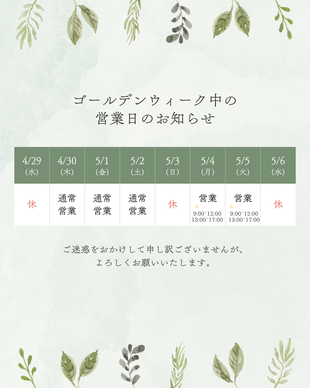 GW中の営業日のお知らせ